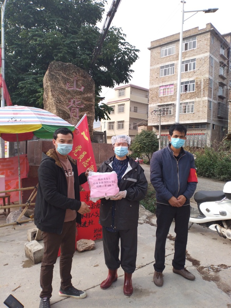 面對(duì)來(lái)勢(shì)洶洶的新型冠狀肺炎疫情,2月12日,玉林市福綿區(qū)樟木鎮(zhèn)新龍山背村防控疫情值勤人員沒(méi)有口罩了。九三學(xué)社廣西區(qū)委宣傳部原部長(zhǎng)楊麗英了解到這一緊急情況后,迅速行動(dòng)、立即聯(lián)系社區(qū)委和九三社員援助。