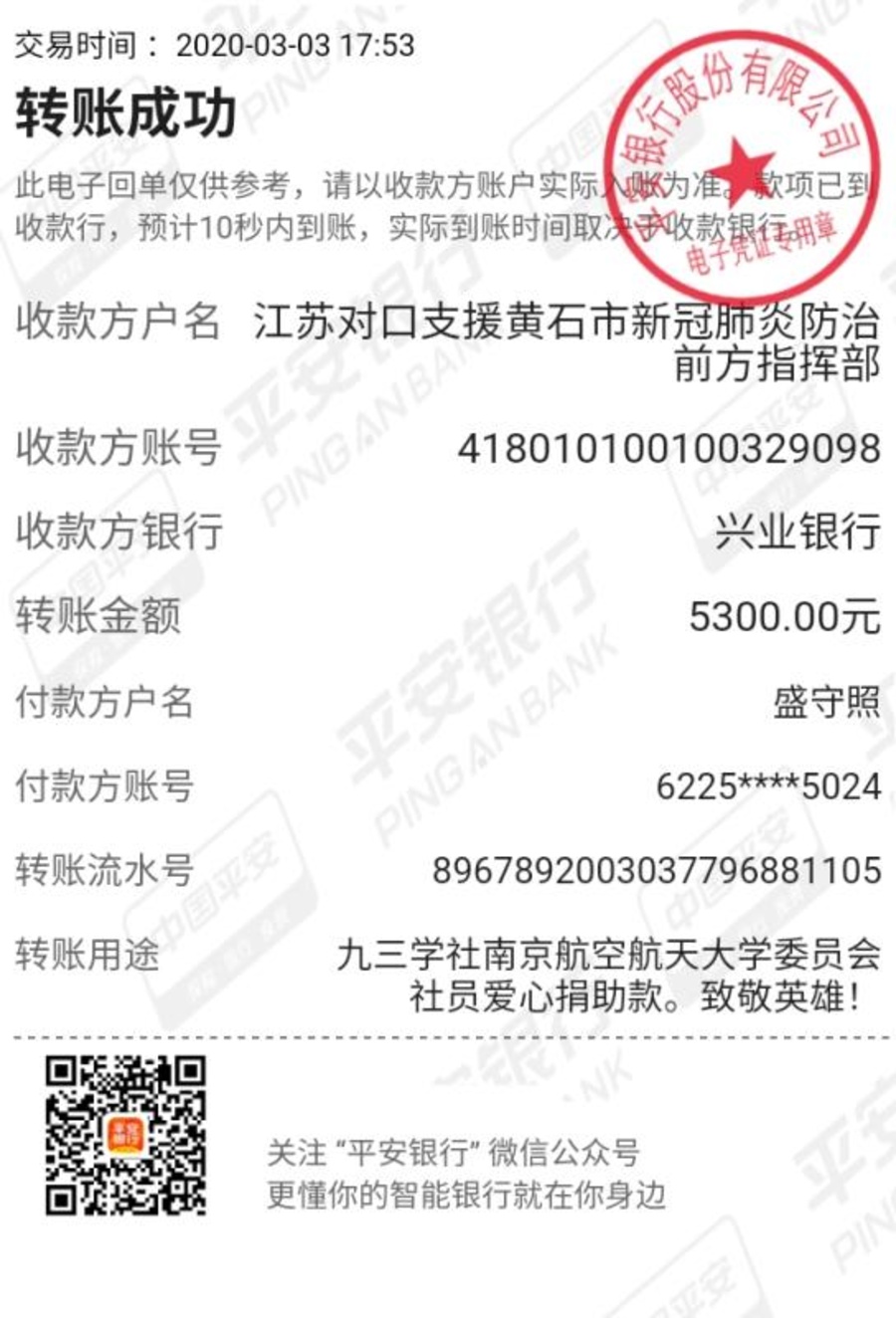 自湖北武漢新冠肺炎疫情發(fā)生以來,全國上下齊行動,與時間賽跑、與病毒較量,爭分奪秒抗擊這場突如其來的“戰(zhàn)疫”。為了支持新冠肺炎疫情防控工作南航九三學社組織了社員自愿捐款。全體社員紛紛慷慨捐款,表達愛心,短短一天時間就籌集愛心款5800元。所有捐款已直接匯入江蘇對口支援黃石市新冠肺炎防治前方指揮部的專用賬號,專門用于支持新冠肺炎疫情防控工作。(金璐)