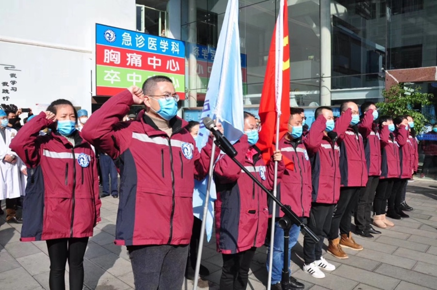 出征儀式現(xiàn)場,饒振譯代表19名隊(duì)員莊嚴(yán)宣誓:“支援湖北,抗擊疫情,不辱使命,堅(jiān)決完成醫(yī)療救援任務(wù)!”