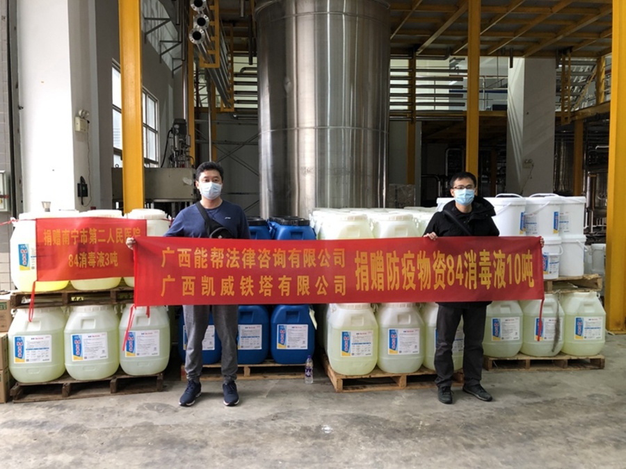 2月13日,九三學(xué)社南寧市法律工作委員會(huì)主任陳建財(cái),九三學(xué)社社員、廣西凱威鐵塔有限公司董事長潘桂權(quán)共同出資7.7萬元購買14噸消毒液,分別捐贈(zèng)給南寧市第四人民醫(yī)院、第二人民醫(yī)院,邕寧區(qū)衛(wèi)健局、邕寧區(qū)中醫(yī)院、桂林市平樂縣,以實(shí)際行動(dòng)助力新冠肺炎疫情防控工作。