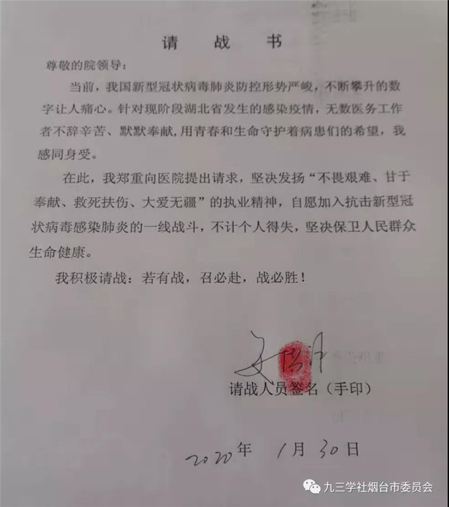 海陽市支社主委、海陽市中醫(yī)醫(yī)院副院長姜洪洋提交了抗擊新型冠狀病毒肺炎疫情一線戰(zhàn)斗的請戰(zhàn)書。