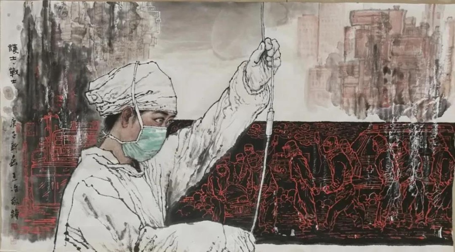 新冠肺炎疫情發(fā)生以來,九三學社社員中的文化工作者、文藝愛好者,感動于全國上下抗擊新冠肺炎疫情所展現(xiàn)出的眾志成城和醫(yī)護人員的家國情懷,紛紛用繪畫、書法、詩詞、歌曲等形式,謳歌白衣戰(zhàn)士,堅定必勝信念,凝聚人心力量。