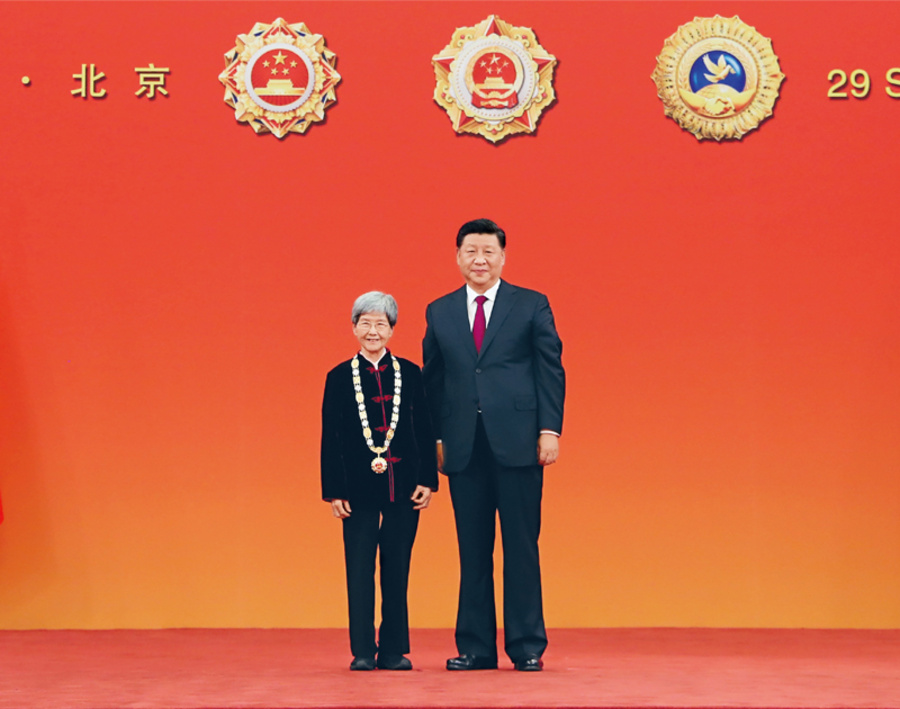2019年9月29日,中華人民共和國國家勛章和國家榮譽稱號頒授儀式在北京人民大會堂金色大廳隆重舉行。中共中央總書記、國家主席、中央軍委主席習近平向“文物保護杰出貢獻者”國家榮譽稱號獲得者樊錦詩頒授獎章。 新華社記者 王曄/攝