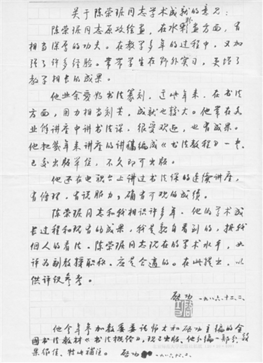 20世紀80年代初,當時的國家教委(現(xiàn)為教育部)委托北京師范大學(xué)主編給大中學(xué)生使用的書法教材——《書法概論》,啟先生任主編,主持編寫工作,當時由先生提議,邀請了在京的蘇士澍、谷谿、龐書田、秦永龍、胡云富組成編寫小組,也請了陳榮琚。他負責寫該書的重要部分章節(jié),聯(lián)系自己的教學(xué)工作,針對學(xué)生讀者的實際,講解詳略適當,文筆流暢。