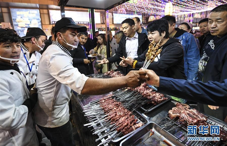 在烏魯木齊五一星光夜市,人們排隊購買烤羊肉串等美食(5月6日攝)。 新華社記者 王菲 攝
