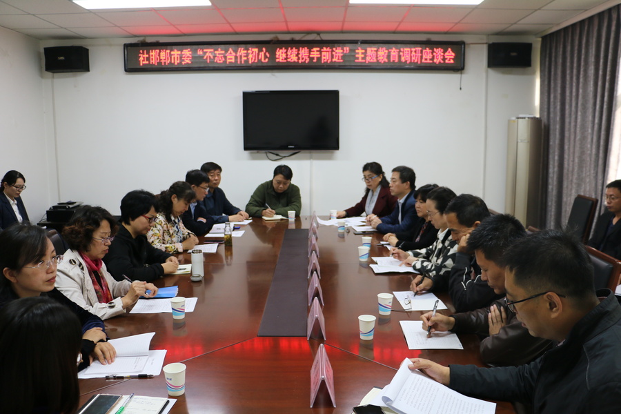 屠志勇匯報(bào)了社邯鄲市委“不忘合作初心,繼續(xù)攜手前進(jìn)”主題教育活動(dòng)開展以來(lái)的工作情況。聽取匯報(bào)后,王素君一行認(rèn)真傾聽各基層組織的座談發(fā)言,并就各支社的主題教育活動(dòng)開展情況及社務(wù)活動(dòng)的特點(diǎn)、成效等方面逐一進(jìn)行深入了解。