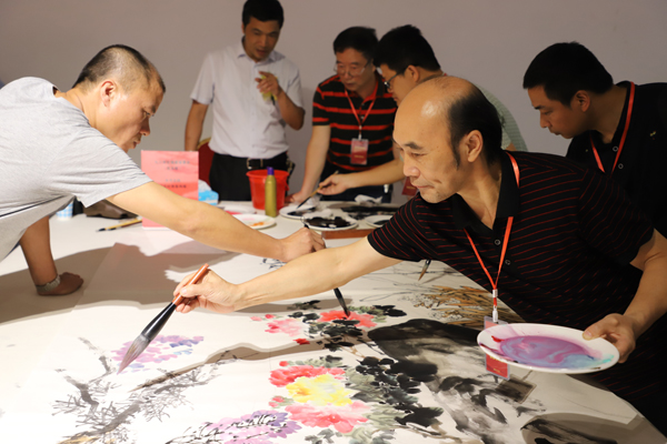 九三學(xué)社福建省委組織鄭盛龍、萬峰、孫讓煜、連錦釗、張常棋、林永正、林葆榮、鐘挺、章城伍、謝新苗等十位社員書畫家在現(xiàn)場暢筆抒懷,合力創(chuàng)作了一幅繁花吐艷圖,獻(xiàn)禮中國共產(chǎn)黨成立100周年。(根據(jù)省委統(tǒng)戰(zhàn)部報(bào)道整理)